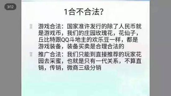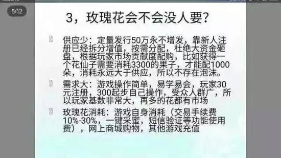 首先,330元注册一个游戏账号,其中30元是系统管理费,300元是账户里的种子,游戏场景是一块地,300元种一棵树,系统拆分的是化肥,每天玩家需登录账号把化肥施到树上,结玫瑰花。每朵玫瑰花价值一元,可用来买卖。所以每个玩家都会通过各种方式来增加自己手里玫瑰花的数量。