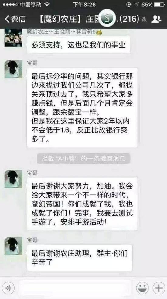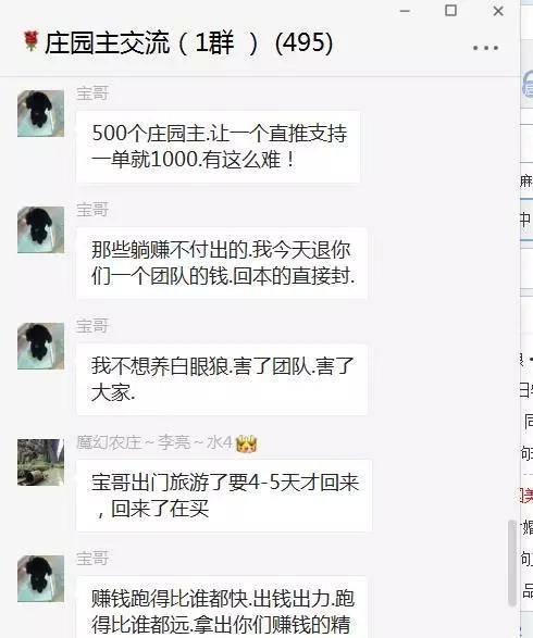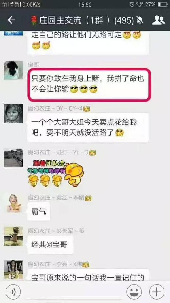 每天,他们所在群的 “头头”们就会把宝哥讲话截图发到群里,(说明一下,只有发展了2000人的庄园主才能进宝哥所在的群里,就是所谓的“头头”,相当于宝哥手下的一级代理),比如: