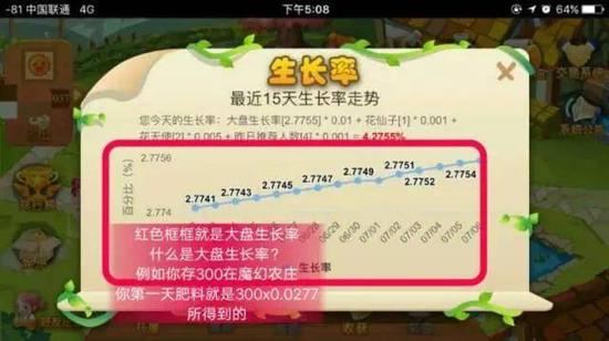 然后根据公式计算个人生长率=大盘生长率(2.77%)+花仙子数x0.001+花天使数量x0.005+推荐人数x0.001。