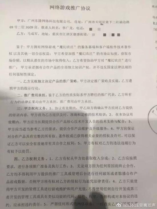 根据魔幻农庄微信公众号注册信息,娱乐资本论查询到主体是一家名为广东掌趣文化传媒有限公司的企业,为2017年3月29日注册。随后娱乐资本论致电该公司股东李广龙,对方回应说是与“宝哥”签订了游戏推广协议,对其中涉及的传销诈骗并不知情。